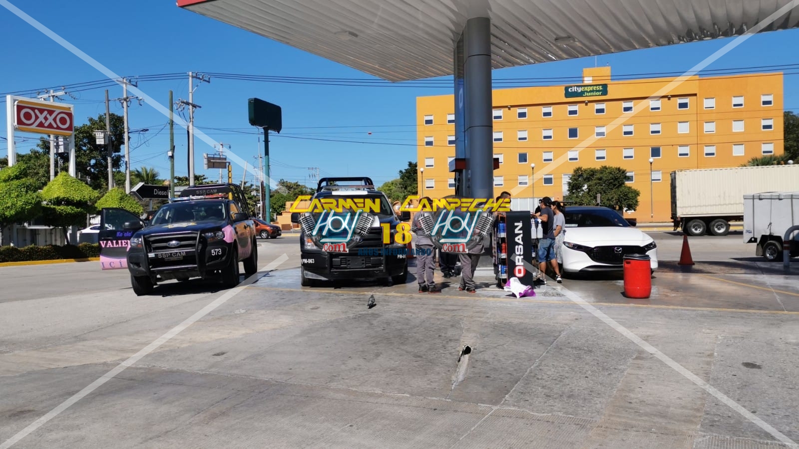 Hechos que trascendieron alrededor de las 11:30 horas de la mañana, al interior de la estación de gasolina “Orsan” la cual se encuentra situada sobre la avenida Isla de tris de la colonia Luís Donaldo Colosio Murrieta, justamente frente al hotel City exprés JR, lugar hasta donde arribaron dos mujeres y un hombre, abordo de un automóvil de lujo de la marca Mazda, color blanco con matrícula de circulación DJZ-51-28 del estado de Campeche, los cuales presuntamente solicitaron a la despachadora que les cargara combustible en modo libre ( Sin límite).