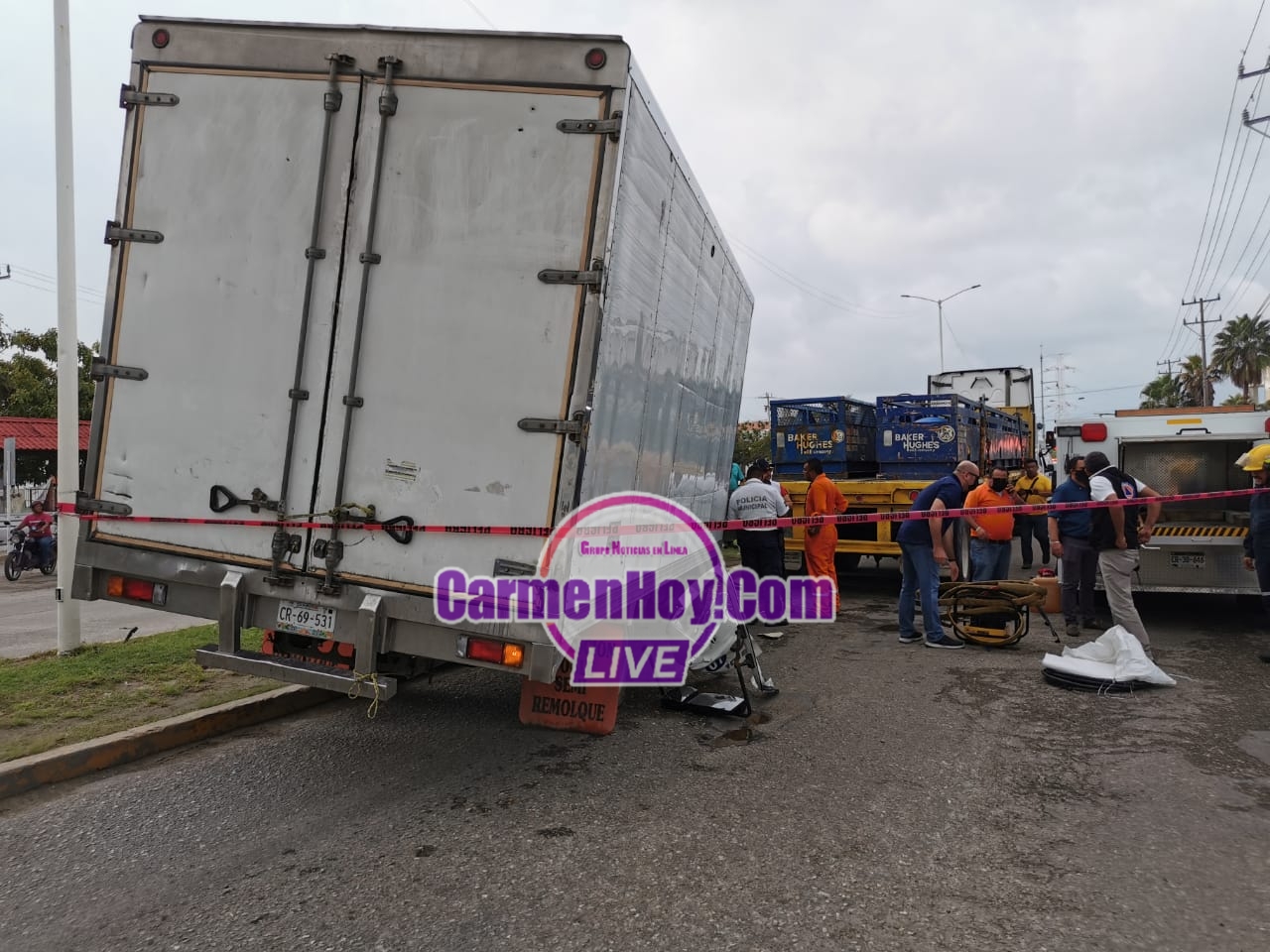 Un joven terminó prensado de la pierna derecha al estrellarse la unidad donde viajaba contra la caja de un tractocamión frente a la plaza Palmira, cuerpos de emergencia y autoridades en el lugar de los hechos, realizando maniobras de rescate.