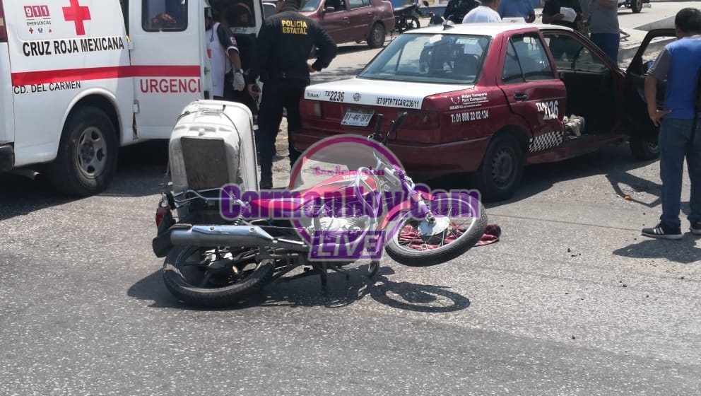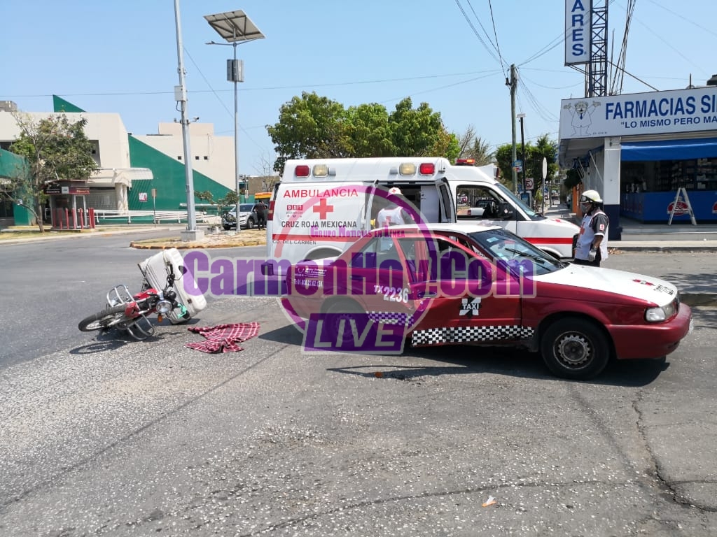 Con golpes múltiples y laceraciones resultó un joven motociclista al salir proyectado luego de ser violentamente embestido por el imprudente ruletero de un taxi mismo que intentó ganarle el paso a la preferencia al motociclista ocasionando dicho accidente.