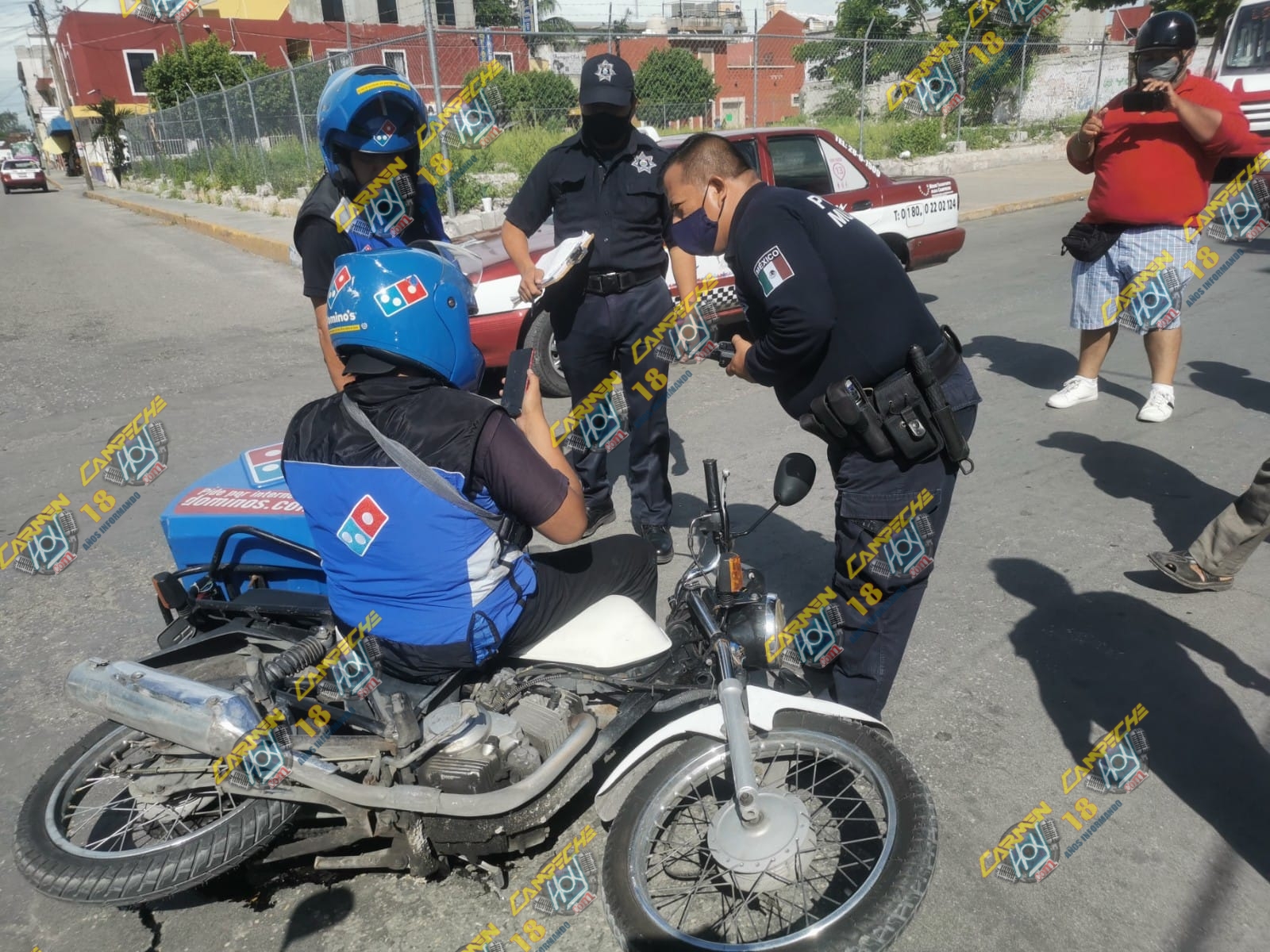 Se desplazaba a exceso de velocidad sobre la calle 35 cuando al llegar al cruce con la 22, omitió realizar el respectivo alto indicado por un señalamiento vial, y al cruzar hizo corte de circulación al guiador de la motocicleta de la marca Yamaha, color blanco con matrícula de circulación WHZ2H de Campeche, propiedad de la compañía de pizzas “Domino’s Pizza” cuyo guiador terminó proyectándose contra el costado lateral derecho y posteriormente quedó tirado al lado de la motocicleta sobre la vialidad, a pesar de que presentaba Golpes en diferentes partes del cuerpo se negó a recibir atención médica.