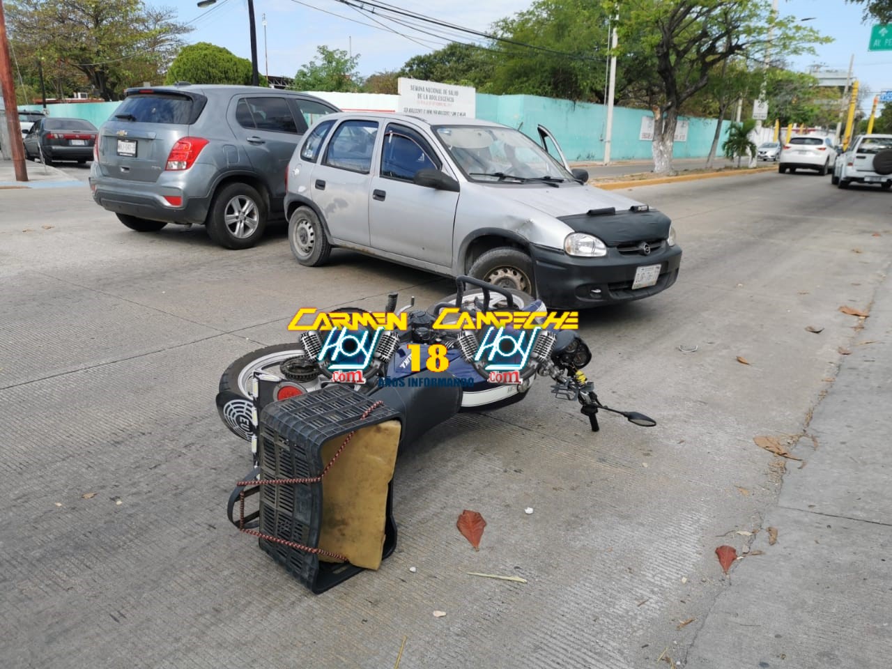 Motociclista resulta lesionado en el rostro al impactar su motocicleta contra un vehículo que se pasó el alto frente a la rectoría de la Universidad Autónoma del Carmen “Unacar”.