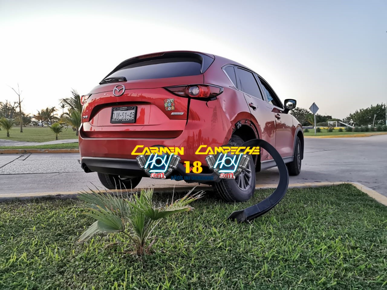 Fue alrededor de las 18:35 horas de la tarde, cuando el imprudente chofer de una furgoneta, color blanco con naranja y matrícula de circulación RH-06-515 del estado de Nuevo León, circulaba sobre el boulevard Juan Camilo Mouriño de la colonia Playa Norte, con dirección al panteón Nuevo. Pero fue justamente en la primer glorieta, que no respeto la preferencia de una camioneta de alta gama de la marca Mazda, CX-5, color rojo vino con matrícula de circulación DJM-51-48 del estado de Campeche, que circulaba dentro de la rotonda en aparente preferencia.