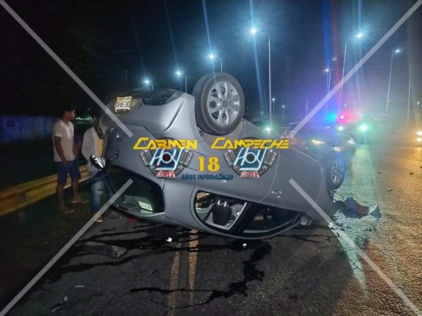 El automóvil que circulaba sobre la avenida 4 carriles con dirección a la glorieta del chechén, se impacto contra los barandales de contención y tras ese fuerte golpe, la unidad se ladeó y volcó por completo, quedando los 4 neumáticos. Aire, un hombre y una mujer, salieron arrastras por las ventanillas.
