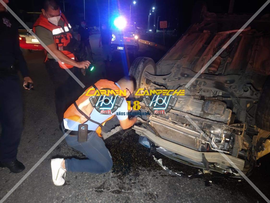 Huyen en taxi los ocupantes de un vehículo que volcaron sobre la avenida 4 carriles por conducir presuntamente a exceso de velocidad y en completo estado de ebriedad; taxistas fueron quiénes dieron parte a las autoridades.