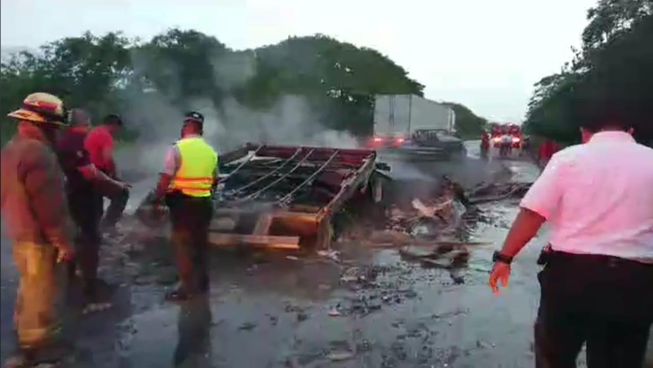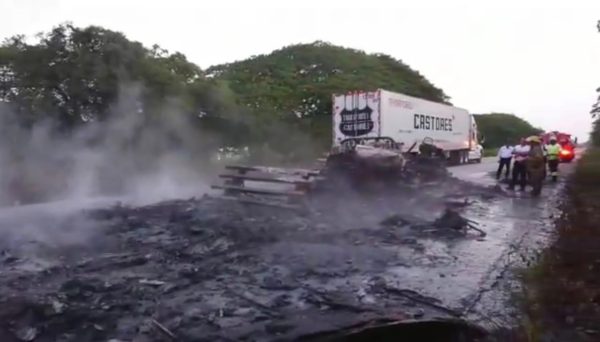 Transportaba plásticos y fue impactado por otro que llevaba fertilizantes, el cual se dio a la fuga. Se desconoce si el chofer quedó calcinado.