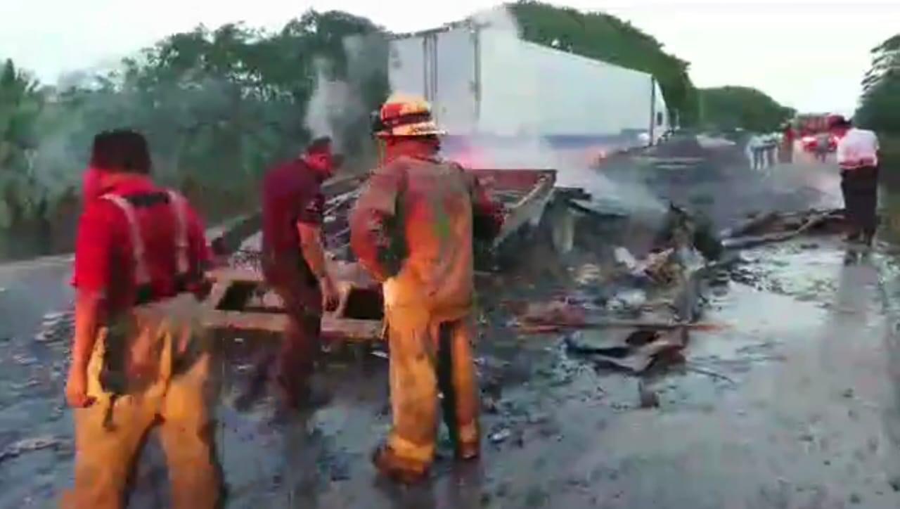 En las inmediaciones de Villamadero, en Seybaplaya, tras ser pactado por otra unidad de carga, un trailer se incendió quedando casi en cenizas.