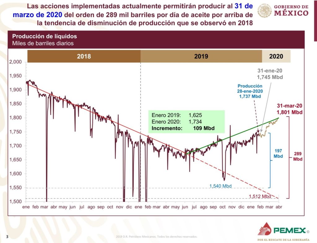 La producción de crudo estimada en el mes de enero es de un millón 734 mil barriles diarios, para finales de marzo 2020 se estima alcanzar un millón 801 mil barriles por día.
