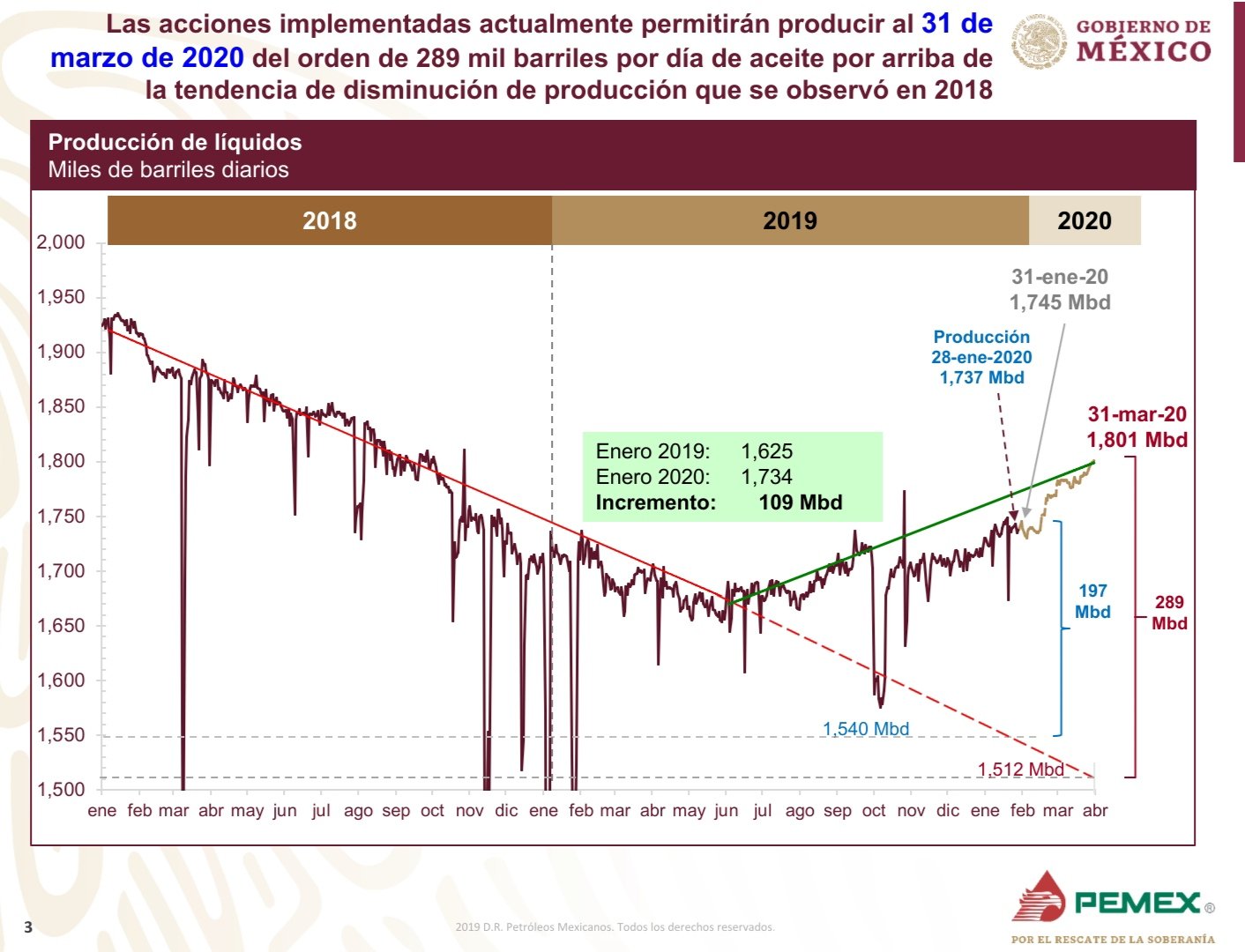 Indicó que, gracias a las acciones implementadas y a la entrada en operación de pozos en nuevos campos se estima que para finales de marzo, la producción nacional alcance un millón 801 mil barriles diarios. Lo anterior representaría un incremento del orden de 289 mil barriles por día por arriba de la tendencia de disminución de producción que se observó en 2018.