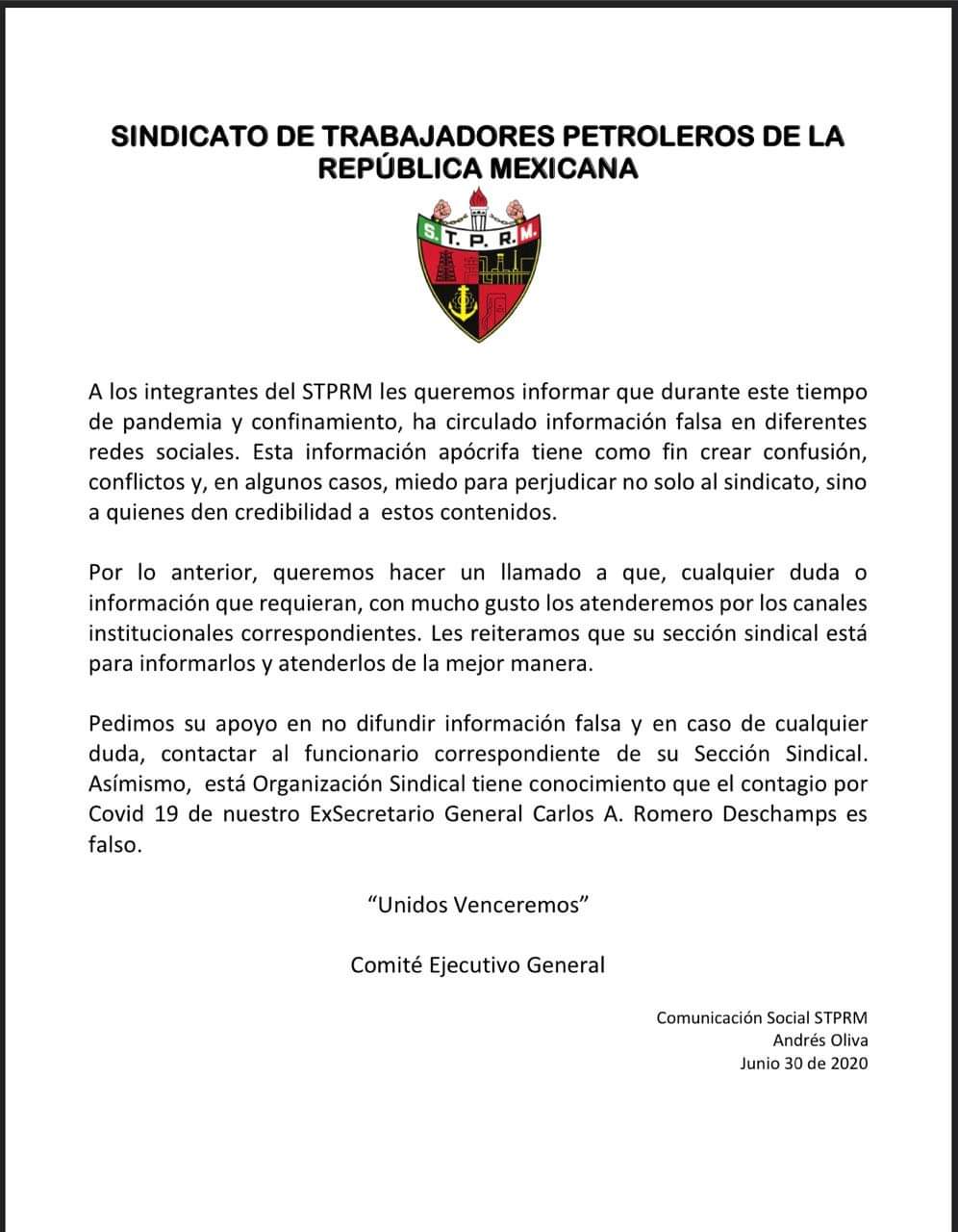 Alerta Sección 47 del Sindicato de Trabajadores Petroleros de La República Mexicana sobre información falsa en torno a Carlos Romero Deschamps