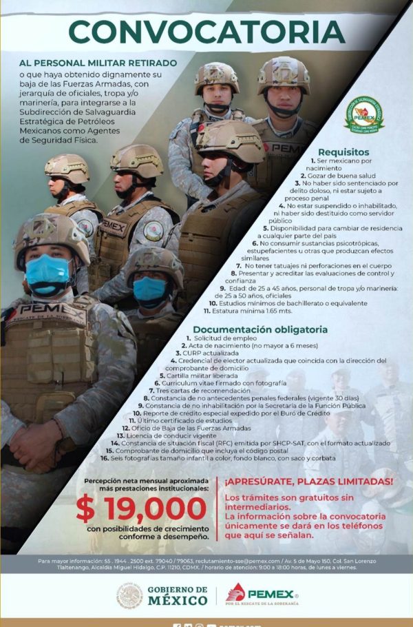 En convocatoria nacional, PEMEX hace un llamado a personal no activo, con jerarquía de oficiales, tropa y/ o marinería para que participen como Agentes de Seguridad Física, con posibilidad de crecimiento conforme a desempeño.