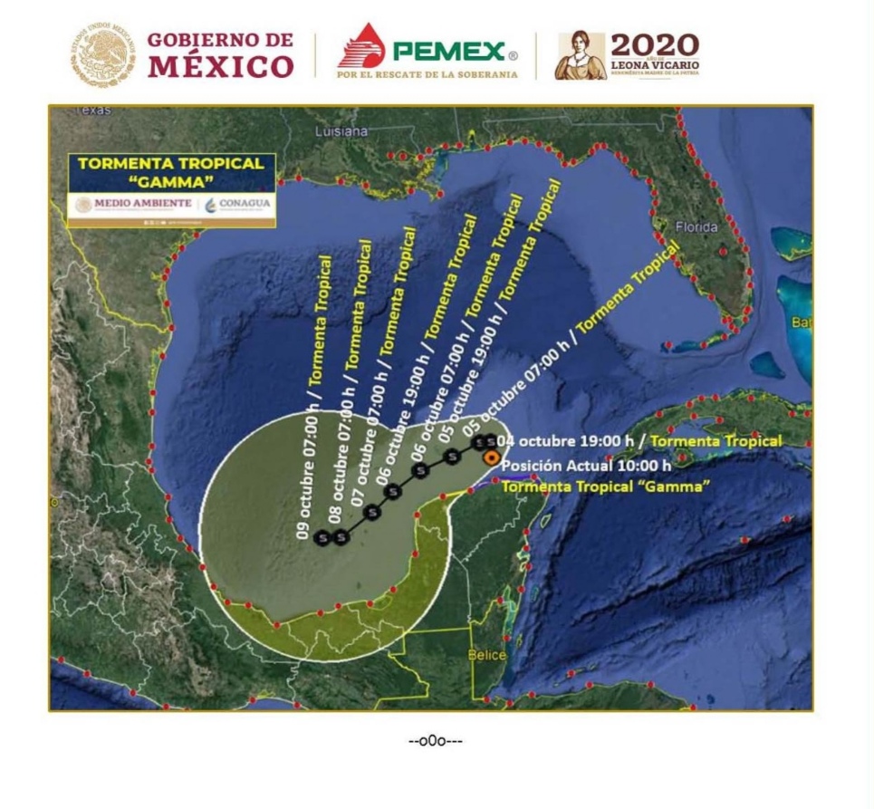 Ciudad del Carmen, Camp. – Petróleos Mexicanos (PEMEX) llevó a cabo su segunda reunión informativa del Plan de Respuesta a Emergencia por Huracanes (PREH), para monitorear la Tormenta Tropical “Gamma”, que se desplaza este domingo al Oeste-Suroeste hacia la Sonda de Campeche, con rumbo a los límites de Veracruz con Tabasco y que este lunes se ubicaría a 110 kilómetros al nor-noroeste de Dzilam, Yucatán.