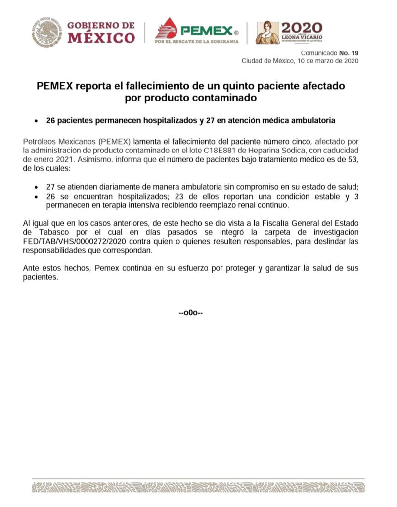 Petróleos Mexicanos (PEMEX) lamenta el fallecimiento del paciente número cinco, afectado por la administración de producto contaminado en el lote C18E881 de Heparina Sódica, con caducidad de enero 2021. Asimismo, informa que el número de pacientes bajo tratamiento médico es de 53, de los cuales:
