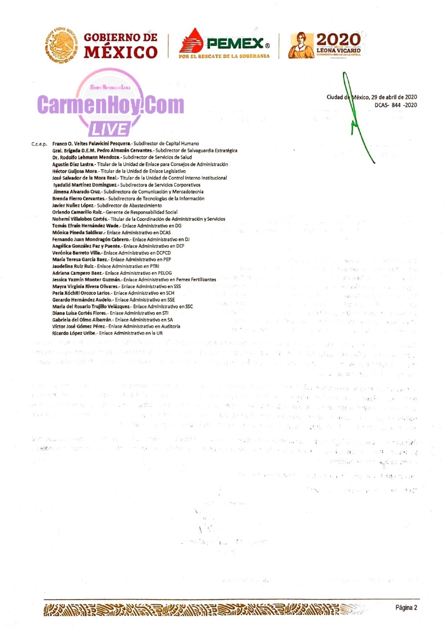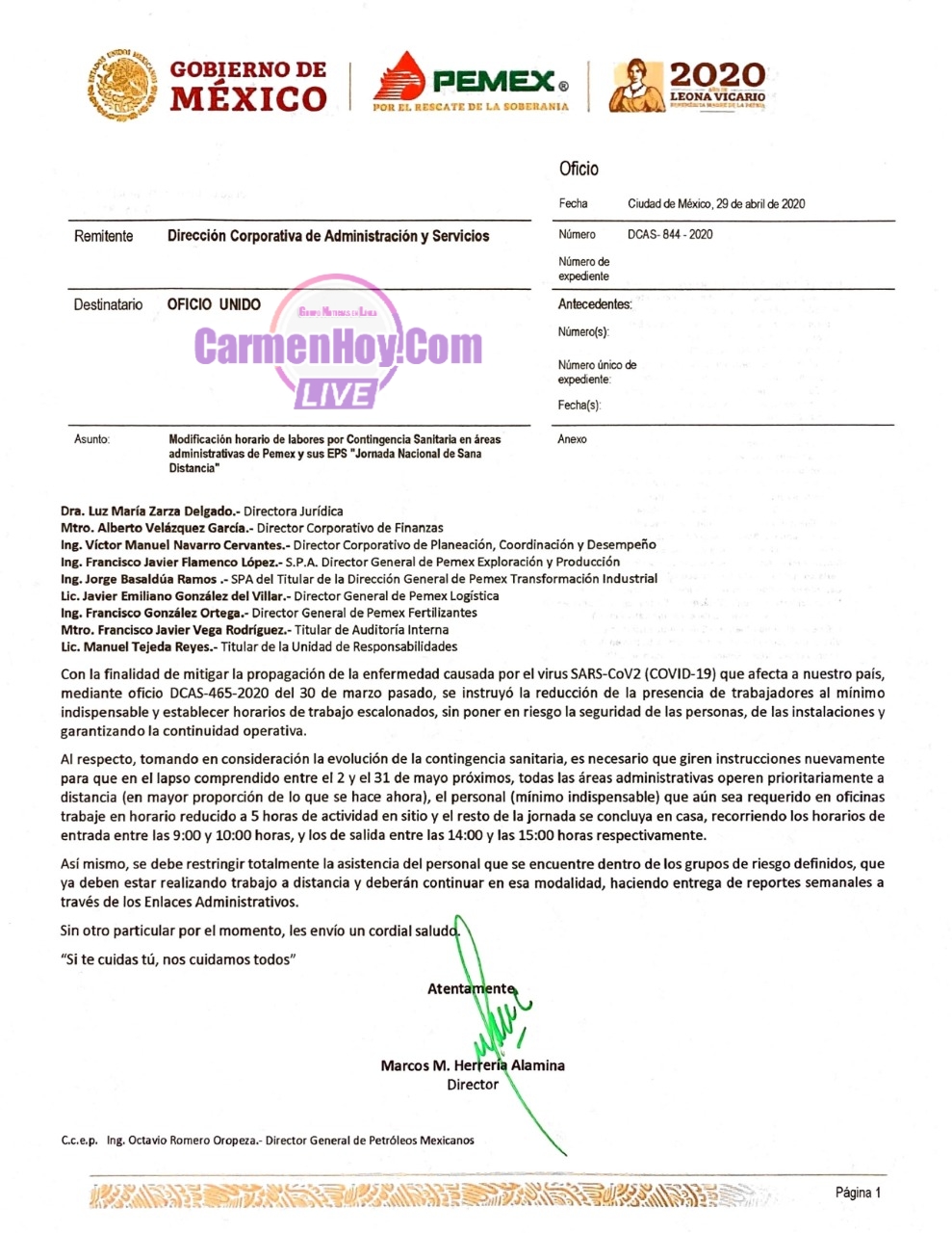 Mediante oficio DCAS-844-2020, Marcos M. Herrería Alamina, Director de la Dirección Corporativa de Administración y Servicios, solicitó la modificación de horario de labores por Contingencia Sanitaria en áreas administrativas de Pemex y sus EPS, respetando la “Jomada Nacional de Sana Distancia”.