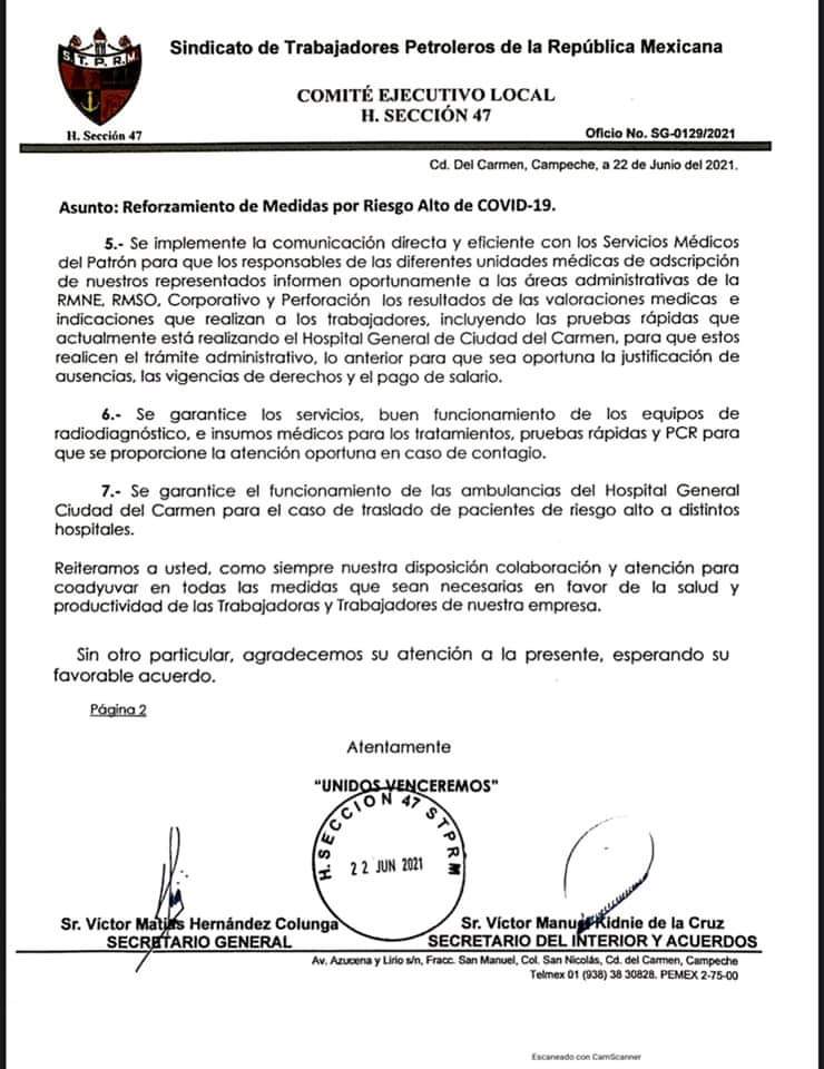 Así mismo exhortamos a nuestros compañeros de instalaciones marinas a no bajar la guardia, mantener la comunicación con sus delegados departamentales y recalcar la importancia de seguir con las medidas sanitarias.