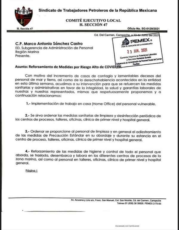 Con motivo del incremento de casos de contagio del personal que labora en instalaciones terrestres y marinas, se llevó a efecto reunión de trabajo con el Subgerente de Administración de Personal, Región Marina C.P. Marco A. Sánchez Castro E.D. Solicitando el cumplimiento a las medidas de prevención sanitarias derivado del aumento de los casos de COVID-19 que han traído como consecuencia el deceso de algunos de nuestros representados.
