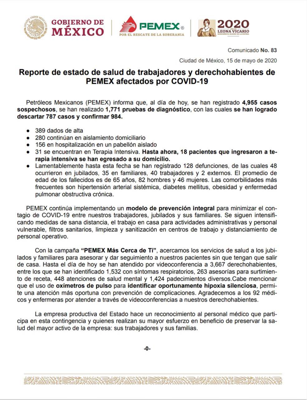 Petróleos Mexicanos (PEMEX) informa que, al día de hoy, se han registrado 4,955 casos sospechosos, se han realizado 1,771 pruebas de diagnóstico, con las cuales se han logrado descartar 787 casos y confirmar 984.