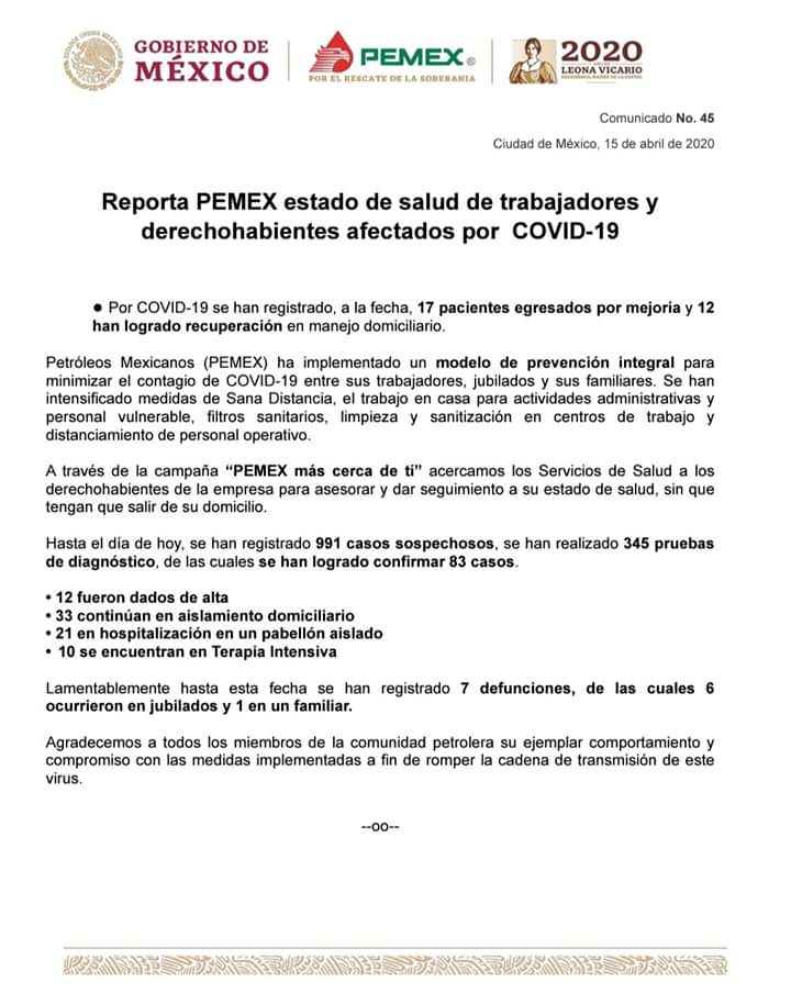 Petróleos Mexicanos (PEMEX) ha implementado un modelo de prevención integral para minimizar el contagio de COVID-19 entre sus trabajadores, jubilados y sus familiares. Se han intensificado medidas de Sana Distancia, el trabajo en casa para actividades administrativas y personal vulnerable, filtros sanitarios, limpieza y sanitización en centros de trabajo y distanciamiento de personal operativo.