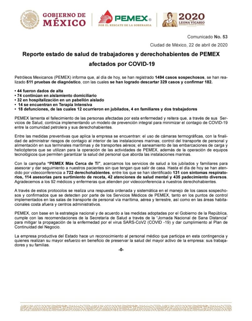 Petróleos Mexicanos (PEMEX) informa que, al día de hoy, se han registrado 1494 casos sospechosos, se han realizado 511 pruebas de diagnóstico, con las cuales se han logrado descartar 329 casos y confirmar 182.