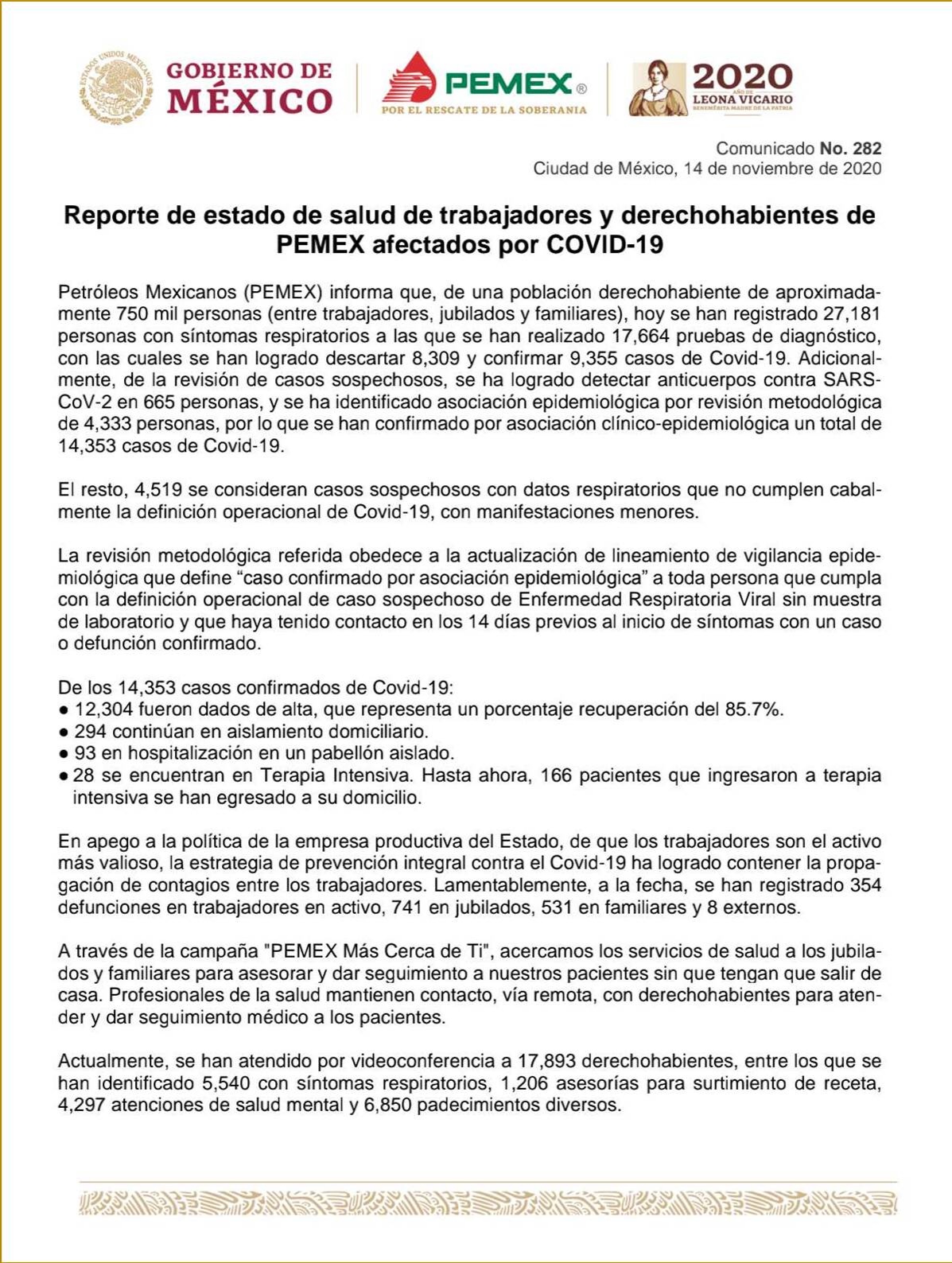 Petróleos Mexicanos (PEMEX) informa que, de una población derechohabiente de aproximadamente 750 mil personas (entre trabajadores, jubilados y familiares), hoy se han registrado 27,181 personas con síntomas respiratorios a las que se han realizado 17,664 pruebas de diagnóstico, con las cuales se han logrado descartar 8,309 y confirmar 9,355 casos de Covid-19. Adicionalmente, de la revisión de casos sospechosos, se ha logrado detectar anticuerpos contra SARS-CoV-2 en 665 personas, y se ha identificado asociación epidemiológica por revisión metodológica de 4,333 personas, por lo que se han confirmado por asociación clínico-epidemiológica un total de 14,353 casos de Covid-19.
