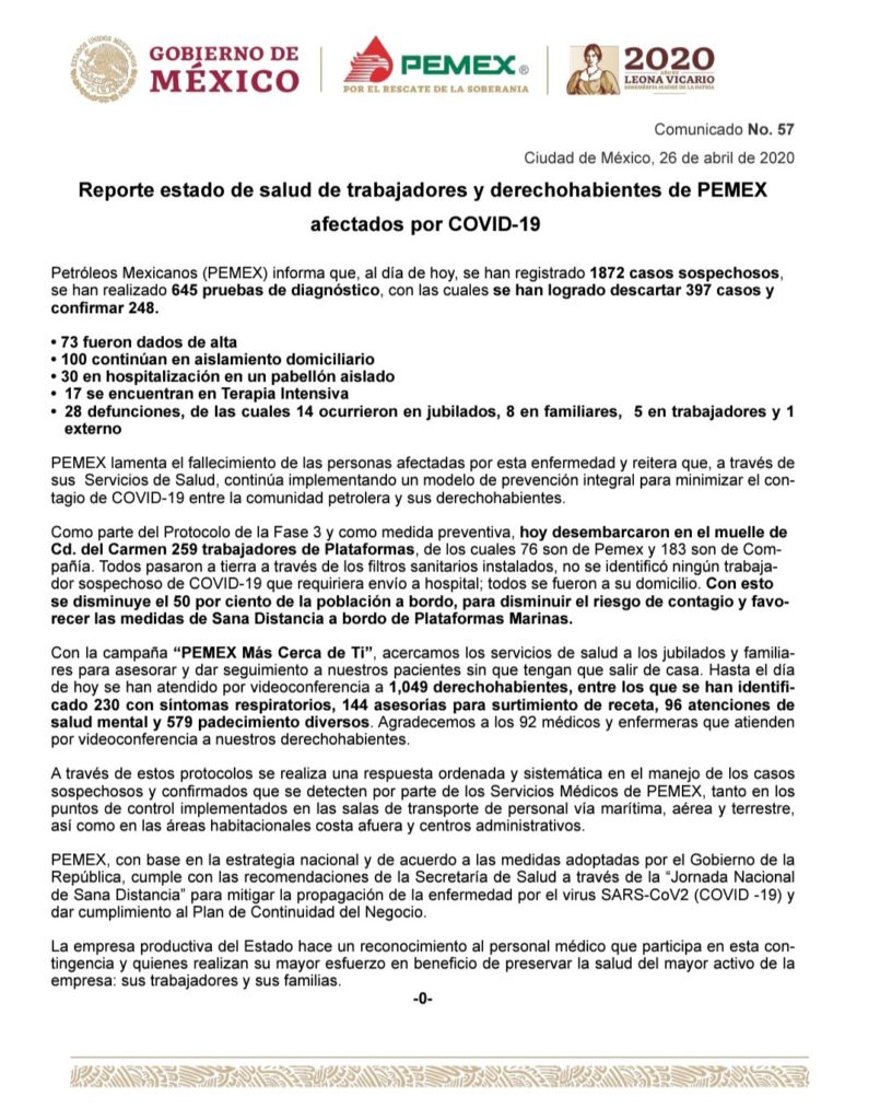 Petróleos Mexicanos (PEMEX) informa que, al día de hoy, se han registrado 1872 casos sospechosos, se han realizado 645 pruebas de diagnóstico, con las cuales se han logrado descartar 397 casos y confirmar 248.