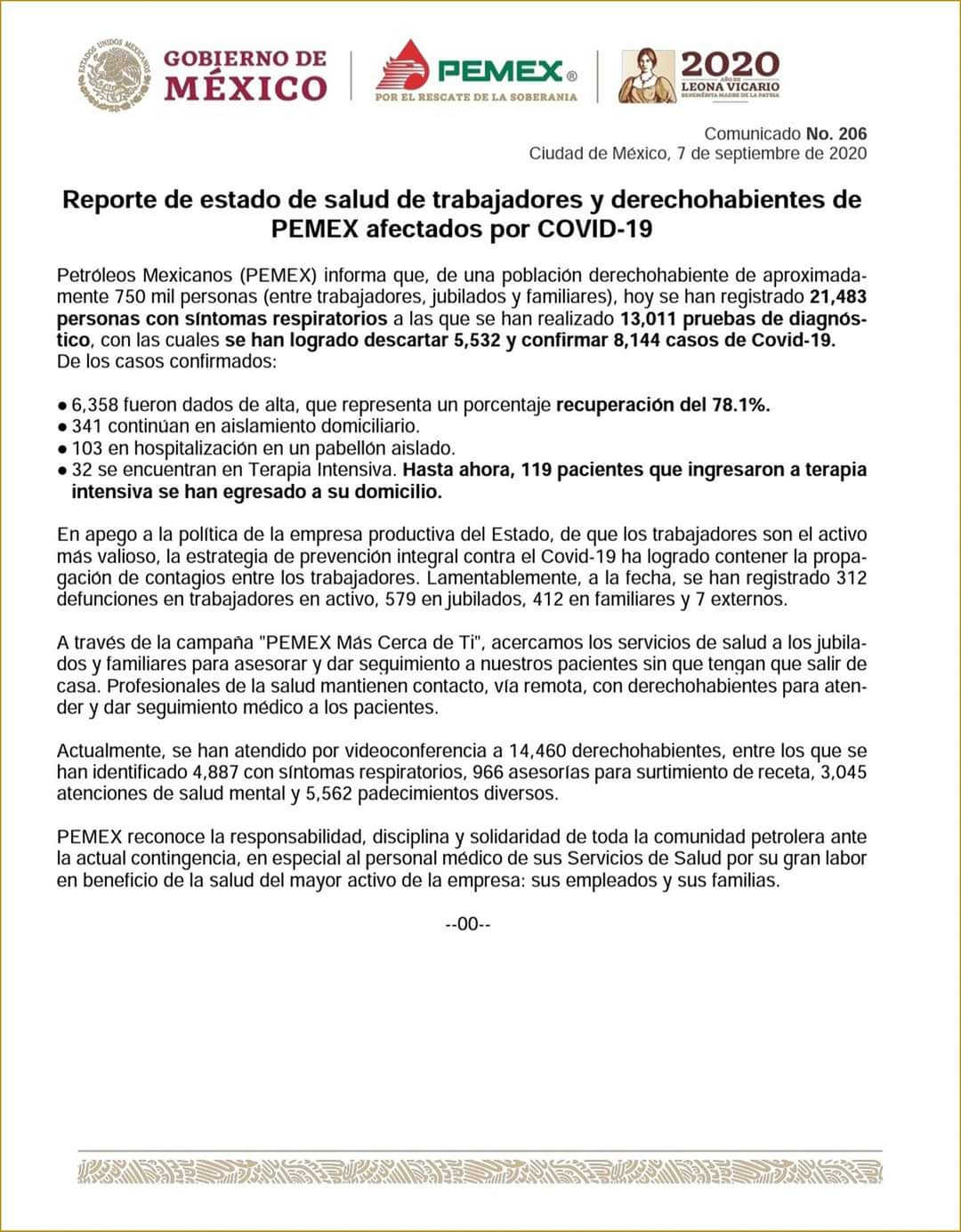 Petróleos Mexicanos (PEMEX) informa que, de una población derechohabiente de aproximadamente 750 mil personas (entre trabajadores, jubilados y familiares), hoy se han registrado 21,483 personas con síntomas respiratorios a las que se han realizado 13,011 pruebas de diagnóstico, con las cuales se han logrado descartar 5,532 y confirmar 8,144 casos de Covid-19.