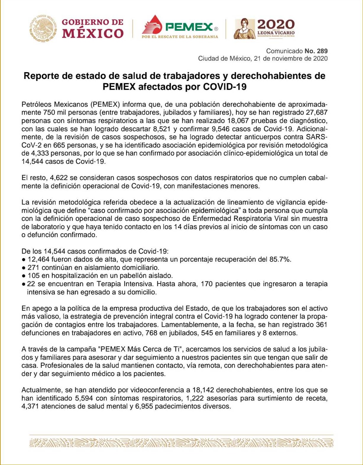 Petróleos Mexicanos (PEMEX) informa que, de una población derechohabiente de aproximadamente 750 mil personas (entre trabajadores, jubilados y familiares), hoy se han registrado 27,687 personas con síntomas respiratorios a las que se han realizado 18,067 pruebas de diagnóstico, con las cuales se han logrado descartar 8,521 y confirmar 9,546 casos de Covid-19. Adicionalmente, de la revisión de casos sospechosos, se ha logrado detectar anticuerpos contra SARS-CoV-2 en 665 personas, y se ha identificado asociación epidemiológica por revisión metodológica de 4,333 personas, por lo que se han confirmado por asociación clínico-epidemiológica un total de 14,544 casos de Covid-19.