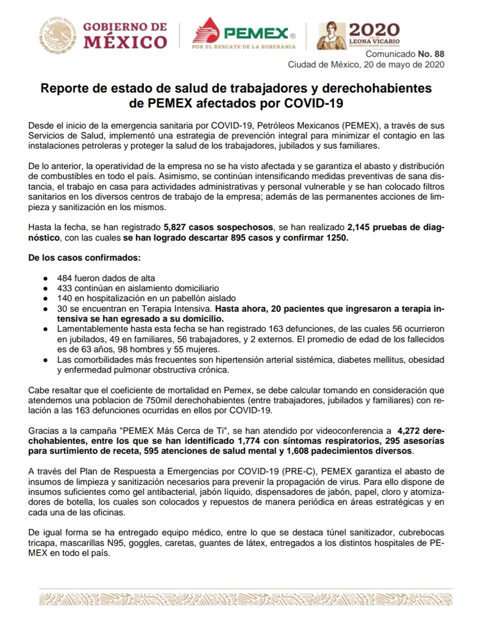 Cabe resaltar que el coeficiente de mortalidad en Pemex, se debe calcular tomando en consideración que atendemos una poblacion de 750mil derechohabientes (entre trabajadores, jubilados y familiares) con relación a las 163 defunciones ocurridas en ellos por COVID-19.